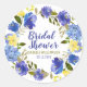 Blue hydrangeas and other summer flowers create a beautiful floral frame on this bridal shower sticker. Bridal Shower is written in a blue modern script font. The bride's name and date follow in a simple classic font. All text can be easily edited. You can also change the font and colour.