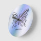 An elegant black ink open butterfly on a purple blue holographic background. Your name is written below in a playful font.