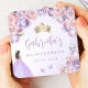 These lovely quinceañera party coasters feature a border of lilac purple and blush pink roses on a purple watercolor background. A gold tiara, a dark-haired girl in a purple princess dress and small purple butterflies decorate the text. The name of the guest of honour appears in elegant purple handwriting script, with the remaining text in purple sans serif font.