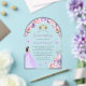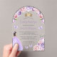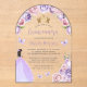 This lovely arch-shaped acrylic quinceañera invitation features a top border of pale purple and blush pink roses arching over a gold tiara. A dark-haired girl in a lavender princess dress and small lavender butterflies decorate the text. The word "Quinceañera" and the name of the guest of honour appear in elegant lavender handwriting script, with the remaining text in grey sans serif font on a your choice of a clear or frosted acrylic background.