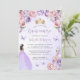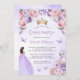 This lovely quinceañera invitation features a border of lilac purple and blush pink roses on a purple watercolor background. A gold tiara, a brunette girl in a purple princess dress and small purple butterflies decorate the text. The word "Quinceañera" and the name of the guest of honour appear in elegant purple handwriting script, with the remaining text in grey sans serif font.
