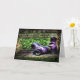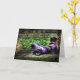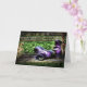 A pair of iconic fashion classic Dr Martens, purple boots with rainbow laces on a park bench. Customise to add you own text on any part of the card.