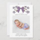 Cute birth announcement card with a photo of your newborn featuring illustration of a purple bow and flowers.