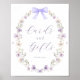 Cards and Gifts sign featuring watercolor wildflower wreath and purple bow. Personalise with your own text. Matching collection in the Adore Paper Co. Zazzle shop.