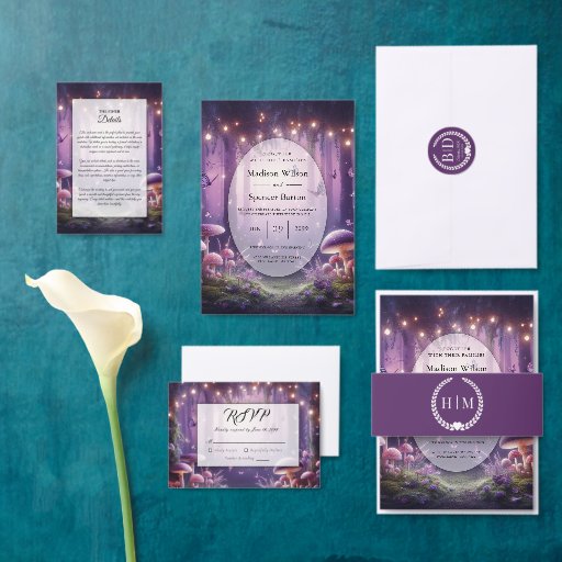 Step into a world of enchantment with this Purple Butterfly’s and Starlit Skies invitation design. Featuring a dreamy twilight forest illuminated by soft string lights, glowing mushrooms, and fluttering butterflies, this whimsical scene creates a magical backdrop for any special occasion.