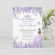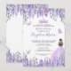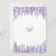 Watercolor Floral Purple Quinceañera Invitation with Butterflies. This enchanting design brings a whimsical lavender garden theme to life, perfect for a Quinceañera celebration. The front features delicate lavender stems in a variety of purple hues, with touches of green leaves and charming watercolor butterflies fluttering throughout for an added magical touch. A mix of classic serif fonts and elegant script typography enhances the design's sophistication and playful charm.