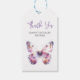 These cute favour tags feature a watercolor butterfly. The words "Thank You" are set in trendy purple script typography. The card reverses to a unique floral and butterflies pattern Use the template fields to add your custom text. A charming choice for spring and summer girl baby showers. To see the complete line visit www.zazzle.com/dotellabelle