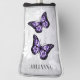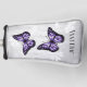 Protect your golf clubs with this unique Purple Butterfly Floral Personalised Golf Head Cover. Cover design features a pair of vibrant butterflies resting on a white floral vine against a light grey grunge background. Additional gift items available with this design as well as a variety of colours.