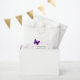 Pretty wedding favour bags with graphics of a purple butterfly decorating a purple whimsical doodle framed text area. Personalise the text to read what you want. Great for all your wedding favour needs.