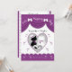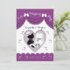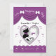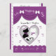 This cute cat couple wedding invitation featuring 2 cats, the bride cat is wearing a purple heart collar and a white wedding veil and the groom cat with a purple heart collar and top hat with a purple band surrounded by floating purple hearts topped with a purple coloured curtain with white bows!