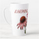 Personalised latte mug with nature design. Big echinacea / coneflowers and bumblebee design. Add a name in printed uppercase letters on one side. A beautiful botanical illustration that features the best of nature, with medicinal herbs and a beneficial pollinator. Colours are red and pink with green.