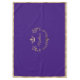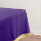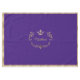Elegant purple coloured cloth table cloth with and gold tone border and graphics of a gold tone flourish and crown text area and custom text. Personalise the text to this lovely addition to your dining table.