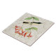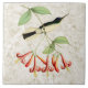 Ceramic tile features a vintage illustration of a Purple-crowned Fairy Hummingbird. A green and white hummingbird with a blue-violet head perches on a coral pink honeysuckle plant, with a light gold marble background.