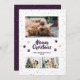 Cute purple photo Meowy Christmas card featuring three photos, snow and paw prints on the front and a snowy background at the back. Easily personalize this cute photo Christmas card with your photos, family name and the year.