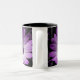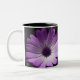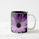 This pretty floral mug would make a lovely gift. It features a beautifully detailed photograph of an African daisy flower. The photo has been digitally altered, resulting in a pretty purple coloured flower with different shades of purple on the petals and a dark purple centre. The design is shown here on a black and white two-tone mug but is also available on several different styles of coffee mug and a travel mug and two glass mugs as well.