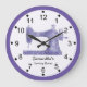 This sewing themed wall clock is printed with a vintage sewing machine graphic image done in a purple damask applique. Personalise the text in the easy Zazzle editor for your favourite sewing or quilting enthusiast. Great wall decor gift for any sewing or crafting space. Available in your choice of round or square styles.