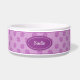 Purple dog paw print pattern background with a darker purple badge that has a personalizable text area for the name of the pet. The font is a lovely script font in white colour.