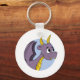 Keychain with illustration of head of a cute purple flying dragon in blue circle, fairy-tale / fantasy design for kids by Maxi Harmony