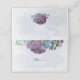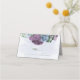 Beautiful romantic wedding place card featuring dusty blue and purple flowers and some green leaves .