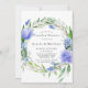Design features a printed coloured with floral element in shades of purple and dusty blue over greenery leaves branch wreath and peony tulip hyacinths flowers on a light lilac light blue watercolor background.. Great for your wedding celebrations!