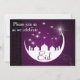 Eid Mubarak greeting illustration with silhouettes of the moon, stars and a mosque. Eid Mubarak lettering in arabic script and an ornamental border.
