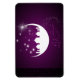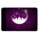 Eid Mubarak greeting illustration with silhouettes of the moon, stars and a mosque. Eid Mubarak lettering in arabic script and an ornamental border.