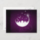 Eid Mubarak greeting illustration with silhouettes of the moon, stars and a mosque. Eid Mubarak lettering in arabic script and an ornamental border.