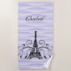 Dry off in style by the pool or at the beach with a Purple Eiffel Tower Flourish Personalised Beach Towel. Towel design features the Eiffel Tower adorned with elegant flourishes against a wavy purple background. Additional colours available with this design as well. This item may be personalised with a name, monogram, or favourite saying of your choosing. Please contact me if you need assistance with personalisation.