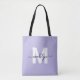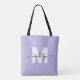 Personalised Girly Light Purple and White Trendy Modern Script Name Monogram Tote Bag. Add a soft and feminine touch to your everyday style with this chic and playful tote bag. Featuring a light purple background and a bold white initial (with no shimmer or foil), paired with a sleek black script name monogram, this tote blends girly elegance with a fresh, modern vibe. With a clean design on both sides, it’s perfect for carrying your essentials to class, work, or a fun day out. Ideal for sorority sisters, bridesmaids, or as a fun gift for a bachelorette party, this tote also makes a fabulous present for birthdays, holidays, or any special occasion. Stylish, functional, and full of personality, this personalised tote bag is the perfect addition to any fashionable girl’s wardrobe.