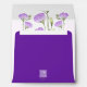 Wedding envelope with elegant bouquet from purple eustomas flowers and light green leaves, pastel coloured spring or summer softness romantic floral eustomas rose flowers. Botanical digital watercolor painting. Floral blossom botany Wedding envelope. Purple Eustomas Collection.