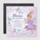Cute and whimsical purple fairy invites guests to your child's birthday party. She has soft blue wings and is dressed in purple and has a purple wand. Purple and blue flowers decorate her hair. This colour scheme is carried into the pretty watercolor decorations. Purple and blue watercolor confetti forms the background along with a geometric gold frame. Purple and turquoise blue butterflies, flowers and hearts float along the gold frame. All of the text is editable. So you can make the invitation for any birthday year.
