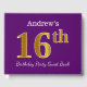 Purple, Faux Gold 16th Birthday Party; Custom Name Guest Book