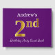 This guest book design features the ordinal number "2nd" with a faux gold-like appearance. It also features a customised name, and a purple coloured background. It could be used at a party for somebody celebrating their second birthday. [~Z0000057]