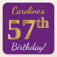 This simple paper coaster design features a message like "Caroline’s 57th Birthday!", with the "57th" having a faux/imitation gold-like colour appearance, on a purple coloured background. The name can be personalised. Personalised paper coasters like these could perhaps be used at a birthday party for somebody who is celebrating their fifty seventh birthday. [~Z0000197]