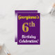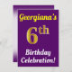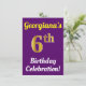 This birthday party invitation design features a message like "Georgiana’s 6th Birthday Celebration!", where the name can be personalised, and where the number "6th" has a faux gold-like appearance. It also features a purple coloured background. The event details on the back can be personalised. It could be used to invite people to somebody’s sixth birthday celebration or birthday party. [~Z0000121]