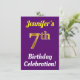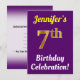 This birthday party invitation design features a message like "Jennifer’s 7th Birthday Celebration!", where the name can be personalised, and where the number "7th" has a faux gold-like appearance. It also features a purple coloured background. The event details on the back can be customised. It could be used to invite people to somebody’s seventh birthday celebration or birthday party. [~Z0000121]