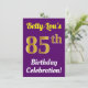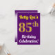This birthday party invitation design features a message like "Betty-Lou’s 85th Birthday Celebration!", where the name can be customised, and where the number "85th" has a faux gold-like appearance. It also features a purple coloured background. The event details on the back can be personalised. It could be used to invite people to somebody’s eighty fifth birthday celebration or birthday party. [~Z0000121]