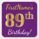 This simple paper coaster design features a message like "FirstName’s 89th Birthday!", with the "89th" having a faux/imitation gold-like colour appearance, on a purple coloured background. The name can be customised. Personalised paper coasters like these could perhaps be used at a birthday party for somebody who is celebrating their eighty ninth birthday. [~Z0000197]