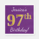 This simple paper napkin design features a message like "Jessica’s 97th Birthday!", with the "97th" having a faux gold-like appearance, on a purple coloured background. The name can be personalised. It could be used at a birthday party for somebody who is celebrating their ninety seventh birthday. [~Z0000085]