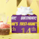 This wrapping paper design features a message like "FIRST-NAME’S 14th BIRTHDAY!", with the "14th" having a faux/imitation gold-like colour appearance, and with the name and "BIRTHDAY" in a fun, bold font. The name can be customised, and the background is coloured purple. Wrapping paper like this could perhaps be used when wrapping birthday gifts being given to somebody in celebration of their fourteenth birthday. [~Z0000206]