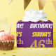 This wrapping paper design features a message like "SHAUNA’S 46th BIRTHDAY!", with the "46th" having a faux/imitation gold-like colour appearance, and with the name and "BIRTHDAY" in a fun, bold font. The name is customisable, and the background is coloured purple. Wrapping paper like this could perhaps be used when wrapping birthday gifts being given to somebody in celebration of their forty sixth birthday. [~Z0000206]