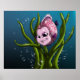 A cute symphysodon discus swims through some seagrass with bubbles surrounding her. Seen in an undersea background with some light coming through on the right. Size of poster is 20.87" x 16.77".