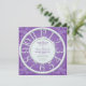 Square main invitation in purple for the Floral Around the Clock Shower Suite. A silver clock face is the focal point of the design. Floral silhouettes surround it, adding a soft, bridal motif. Choose from three different background colours: teal, pink, or purple. With the bold clock and bright colours, no one will mistake the theme of the shower!