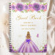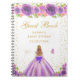 This elegant and glamourous sweet sixteen guest book features a beautiful princess with blonde hair and fair skin in a purple ball gown. The text combines handwritten script and modern sans serif fonts for a classy and sophisticated look. The floral arrangements, butterflies and gold confetti create the perfect blend of rustic and chic.