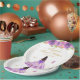 This elegant and glamourous sweet sixteen plate features a beautiful princess with dark hair and dark skin in a purple ball gown. The text combines handwritten script and modern sans serif fonts for a classy and sophisticated look. The floral arrangements, butterflies and gold confetti create the perfect blend of rustic and chic.