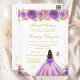 This elegant and glamourous sweet sixteen birthday invitation features a beautiful princess with dark hair and dark skin in a purple ball gown. The text combines handwritten script and modern sans serif fonts for a classy and sophisticated look. The floral arrangements, butterflies and gold confetti create the perfect blend of rustic and chic.