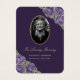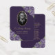 Beautiful purple floral memory card/funeral prayer card featuring a photo adorned with purple roses and baby's breath on a dark purple background.