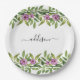 Purple floral garland and typography spring Paper Plate. A lovely garland with greenery and purple flowers and your name in calligraphy style are the elements of this paper plate.