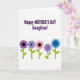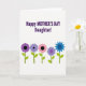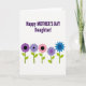 This card features a white background with a large message that reads “Happy MOTHER'S DAY Daughter!” in deep purple, set across the upper half for instant focus. The lettering is in a simple, sans-serif style, with “MOTHER'S DAY” standing out in all caps while “Happy” and “Daughter!” balance the line above and below. The open space around the words keeps the layout airy and lets the greeting feel direct and affectionate ❤️. Along the lower portion, five stylized flowers form a neat horizontal row, like a small garden border that quietly supports the message. Each flower has a dark circular center and scalloped petals, colored in shades of plum, lavender, soft rose, muted violet, and bright blue for a friendly, welcoming mix. Slender green stems with small almond-shaped leaves add a gentle, caring touch, like a thoughtful bouquet offered with a smile 🌼. The flowers sit evenly spaced near the bottom edge, with their stems pointing downward and petals facing forward.