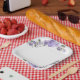 Paper plates with a beautiful purple floral design.